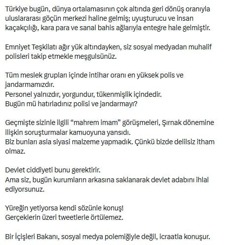 Ali Yerlikaya, size yöneltilen siyasi eleştirilere kendi adınıza cevap vermek yerine polisimizin ve jandarmamızın arkasına saklanarak yanıt vermeyi seçtiniz.