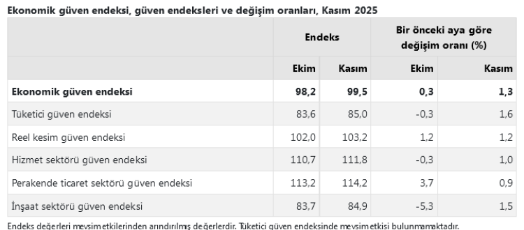 Ekim ayında 98,2 olan ekonomik güven endeksi, Kasım’da yüzde 1,3’lük artışla 99,5 seviyesine çıktı. Tüm alt endekslerde yükseliş görüldü. Veriler, Kasım ayında ekonominin genelinde sınırlı ancak yaygın bir iyileşmeye işaret etti.