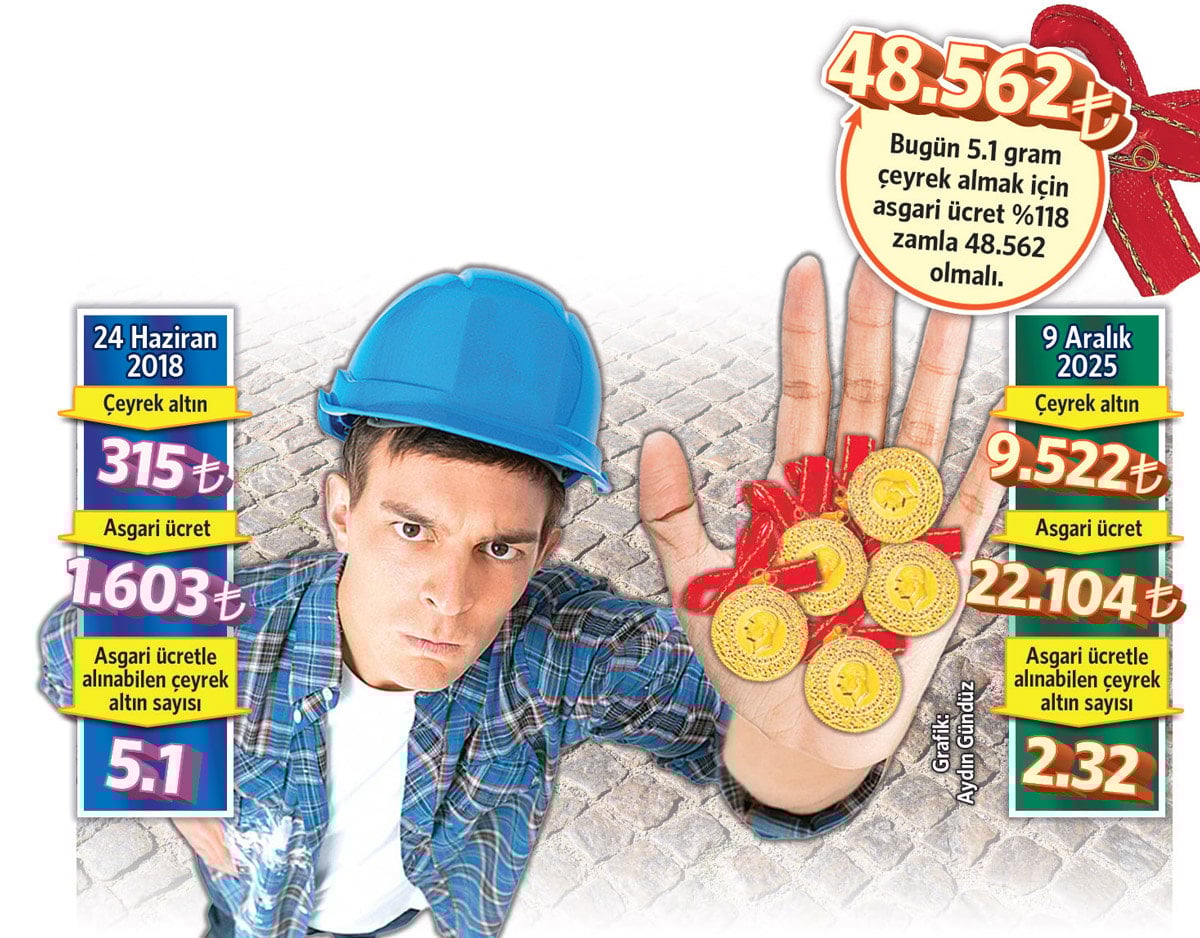 Yaşanan siyasi ve ekonomik krizlerin faturası emekçilere kesildi ve çalışanların alım gücü erim erim eridi. 2018’de asgari ücretle 5.1 çeyrek altın alınırken, bugünkü asgari ücretle yalnızca 2.32 çeyrek alınabilir oldu. Yılın son ayında yeni yılın asgari ücretine dair tartışmalar sürerken işçi, “Yetki istediğin yılki alım gücünü ver yeter” diyor.