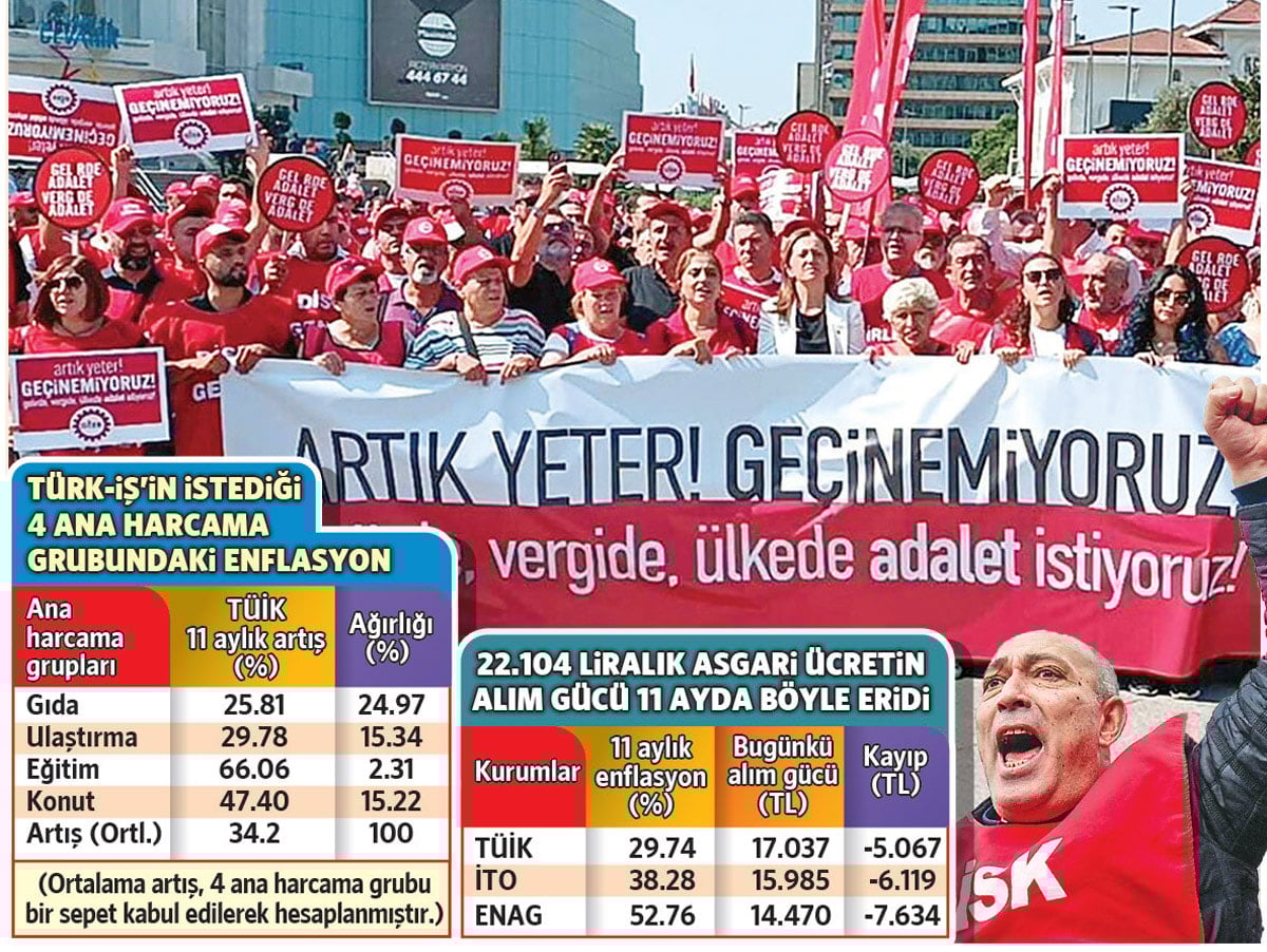 Türkiye İşçi Sendikaları Konfederasyonu (Türk-İş) de masaya oturmak için asgariye önce yüzde 14 enflasyon farkı ödemesi yapılmasını, yani ön ödemeli zam yapılmasını istemişti. Türk-İş’in gündeme getirdiği enflasyon kalemleri asgari ücretin 2026’da 33 bin 816 lira olması gerektiğini gösteriyor.
