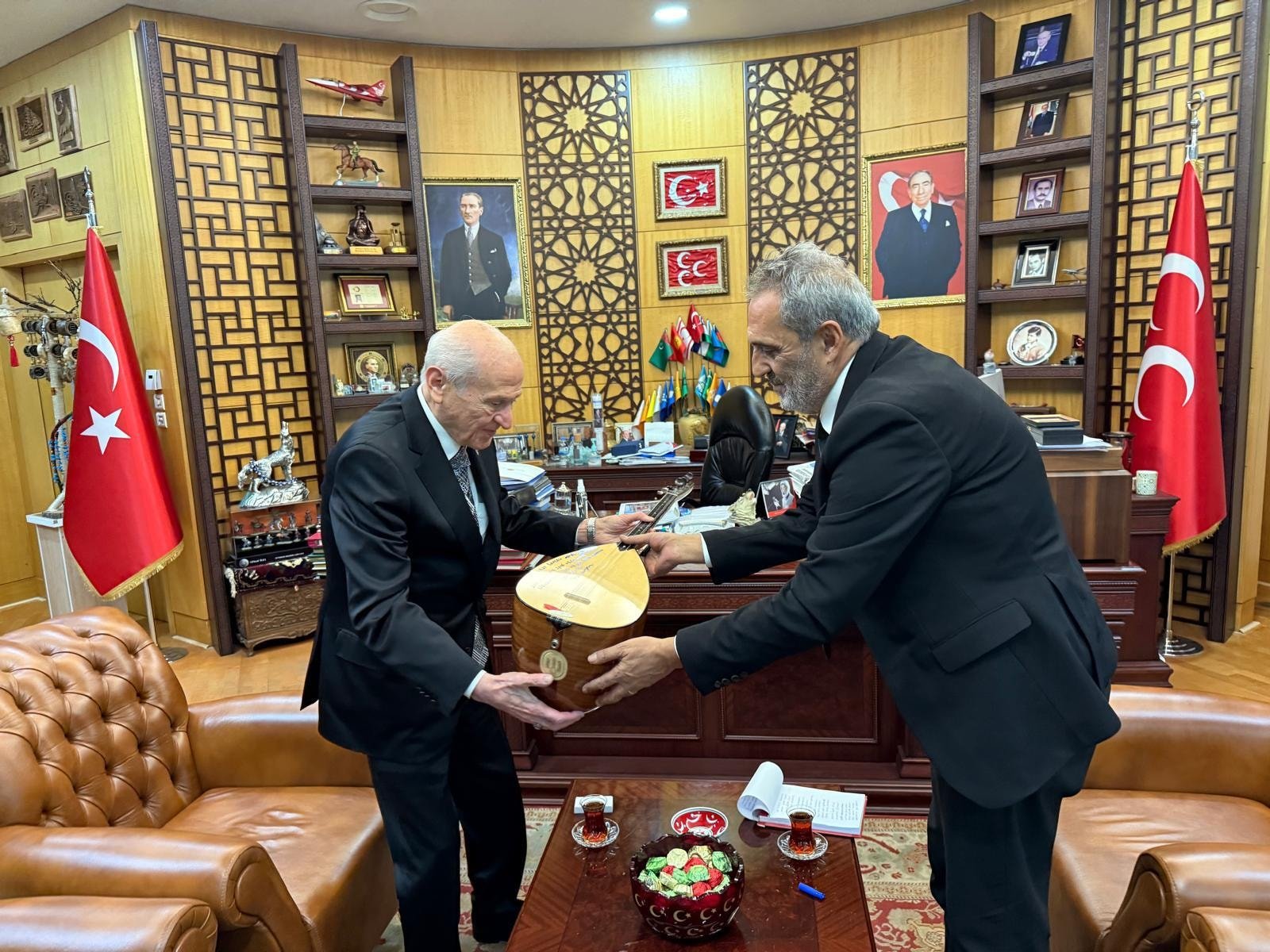 Türkücü Yavuz Bingöl, MHP lideri Devlet Bahçeli'yi makamında ziyaret etti. Bingöl görüşmenin ardından bağlamasını Bahçeli'ye teşekkür etti.